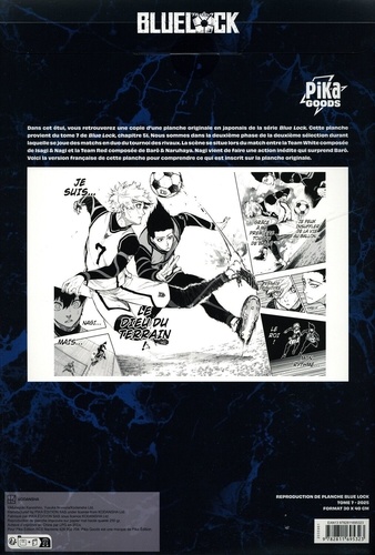 DES REPRODUCTIONS DE PLANCHES ORIGINALES POUR AFFICHER VOTRE FAN ATTITUDE AVEC STYLE ! Facsimilée des planches originales, chaque reproduction représente une scène emblématique de la série, issue du tome 7 du manga Blue Lock. Imprimée sur un papier épais, de qualité et au format 30 x 40cm, elle pourra être encadrée ou vous pourrez la conserver dans son étui. Chaque étui indique la provenance de la planche dans la série et également une impression de la version française de la planche : vous pourrez ainsi vous amuser à surprendre vos ami·e·s ! Informations techniques : Une reproduction de planche d'une scène mythique du manga Blue Lock issue du tome 7, avec le texte japonais (traduit en français sur le packaging) Format : 30 x 40 cm, haute qualité d'impression