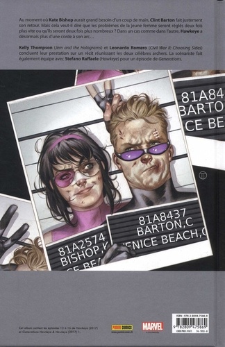 Au moment où Kate Bishop aurait grand besoin d'un coup de main, Clint Barton fait justement son retour. Mais cela veut-il dire que les problèmes de la jeune femme seront réglés deux fois plus vite ou qu'ils seront deux fois plus nombreux ? Dans un cas comme dans l'autre, Hawkeye a désormais plus d'une corde à son arc... Kelly Thompson (Jem and the Holograms) et Leonardo Romero (Civil War ll : Choosing Sides) concluent leur prestation sur un récit réunissant les deux célèbres archers. La scénariste fait également équipe avec Stefano Raffaele (Hawkeye) pour un épisode de Generations. Cet album contient les épisodes 13 à 16 de Hawkeye (2017) et Generations : Hawkeye & Hawkeye (2017) 1.