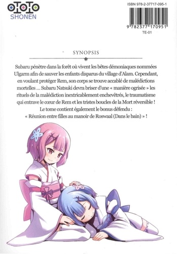 Subaru pénètre dans la forêt où vivent les bêtes démoniaques nommées Ulgarm afin de sauver les enfants disparus du village d'Alam. Cependant, en voulant protéger Rem, son corps se trouve accablé de malédictions mortelles ... Subam Natsuki devra briser d'une "manière ogrisée" les rituels de la malédiction inextricablement enchevêtrés, le traumatisme qui entrave le coeur de Rem et les tristes boucles de la Mort réversible ! Le tome contient également le bonus défendu : "Réunion entre filles au manoir de Roswaal (Dans le bain)" !