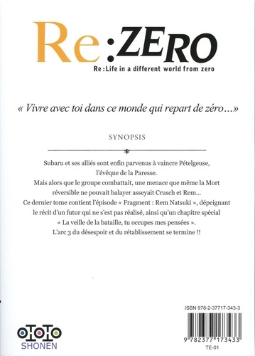 Subaru et ses alliés sont enfin parvenus à vaincre Pételgeuse, l'évêque de la Paresse. Mais alors que le groupe combattait, une menace que même la Mort réversible ne pouvait balayer asseyait Crusch et Rem... Ce dernier tome contient l'épisode "Fragment : Rem Natsuki", dépeignant le récit d'un futur qui ne s'est pas réalisé, ainsi qu'un chapitre spécial "La veille de la bataille, tu occupes mes pensées". L'arc 3 du désespoir et du rétablissement se termine !!