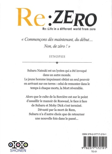 Subaru Natsuki est un lycéen qui a été invoqué dans un autre monde. Le jeune homme impuissant obtint un seul pouvoir en arrivant sur ces terres : celui de remonter dans le temps à chaque morts, la Mort réversible. Alors que le culte de la Sorcière est sur le point d'assaillir le manoir de Roswaal, le face à face de Subaru et Moby Dick s'est terminé. Dévasté par la mort de Rem, Subaru n'a d'autre choix que de retourner une nouvelle fois dans le passé...