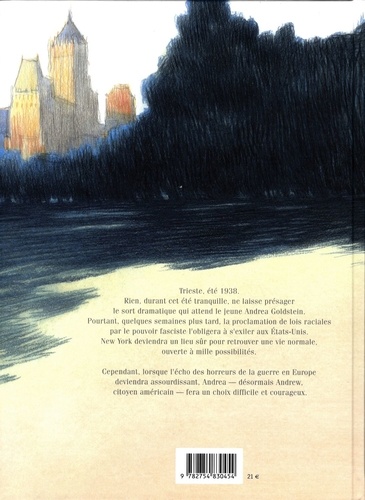 Trois cousins juifs, Andrea, Martino et Cati, sont persécutés par les lois raciales de Mussolini à l'aube de la seconde guerre mondiale. Forcé de quitter Trieste pour New York, Andrea essaiera de retrouver une vie normale, hanté par les fantômes du passé. A travers le destin d'Andrea Goldstein, jeune homme juif, Andrea Serio nous fait percevoir avec douceur et empathie, l'intensité, la violence, la bêtise crasse et innommable de cette sombre époque, comme les prémisses mortifères de ce qu'à nos portes, certains de nos contemporains vivent aujourd'hui". A dater du jour du 15 octobre 1938, Victor Emmanuel III, par la grâce de Dieu et par la volonté de la nation, roi d'Italie, empereur d'Ethiopie, ayant entendu le Conseil des ministres, décrète que tous les enseignants de race juive seront suspendus de leur service, et ne pourront être inscrits les élèves de race juive. Sont considérées comme de race juive les personnes nées de parents tous deux de race juive, quand bien même elles professeraient une autre religion que la religion juive. . ". L'immigration et le racisme sont au coeur de ce récit subtil et contemplatif. Rhapsodie en bleu est un authentique choc esthétique. Andrea Serio retrace toutes les nuances des émotions qui nous portent à la lecture du livre par la grâce et la variété de ses couleurs pastel qui rappellent celles de Lorenzo Mattotti. Rhapsodie en bleu est l'adaptation libre du roman de Silvia Cuttin, inédit en France, (Ci sarebbe bastato) qui s'est inspirée de l'histoire douloureuse de sa famille pour écrire ce récit.