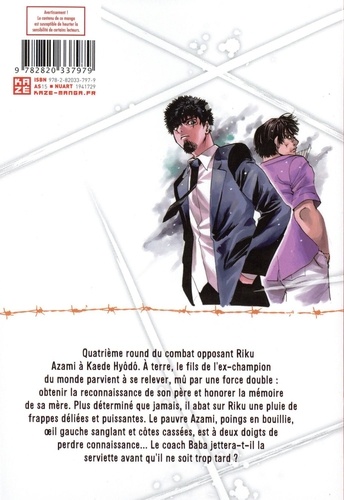 Quatrième round du combat opposant Riku Azami à Kaede Hyûdô. A terre, le fils de l'ex-champion du monde parvient à se relever, mû par une force double : obtenir la reconnaissance de son père et honorer la mémoire de sa mère. Plus déterminé que jamais, il abat sur Riku une pluie de frappes déliées et puissantes. Le pauvre Azami, poings en bouillie, oeil gauche sanglant et côtes cassées, est à deux doigts de perdre connaissance... Le coach Baba jettera-t-il la serviette avant qu'il ne soit trop tard ?