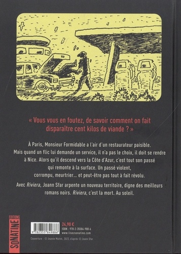 Le prolifique Joann Sfar s'attaque au noir avec ce roman graphique qui magnifie Nice et met en scène M. Formidable un criminel qui se croyait rangé des voitures. Le tout avec seulement un simple feutre noir et un humour à la San-Antonio " Vous vous en foutez, de savoir commenton fait disparaître cent kilos de viande ? " Monsieur Formidable croyait s'être rangé. A Paris, il partage son temps entre sa femme, sa guitare et les clients qui jouent au poker dans l'arrière-salle de son restaurant. Mais quand un flic vient le trouver pour lui confier une mission, il n'a d'autre choix que d'abandonner sa vie paisible. Le voilà au volant, direction Nice, sa ville natale. Mais tandis qu'il file vers le Sud, le criminel refait surface... Raconter la Côte d'Azur et ses paysages avec un simple feutre et aucune couleur, c'est une contrainte qui sied à Joann Sfar. Avec Riviera, il esquisse le parcours de son alter ego, un Niçois plus vieux et plus méchant, compagnon de route parfait pour arpenter un territoire digne des meilleurs romans noirs. Riviera, c'est la mort. Au soleil.