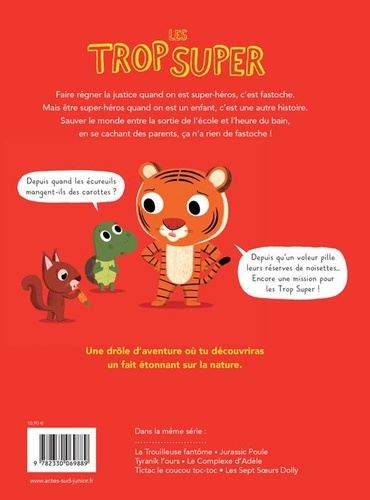 Faire régner la justice quand on est super-héros, c'est fastoche. Mais être super-héros quand on est un enfant, c'est une autre histoire. Sauver le monde entre la sortie de l'école et l'heure du bain, en se cachant des parents, ça n'a rien de fastoche ! Depuis quand les écureuils mangent-ils des carottes ? Depuis qu'un voleur pille leurs réserves de noisettes... Encore une mission pour les Trop Super ! Une drôle d'aventure où tu découvriras un fait étonnant sur la nature.
