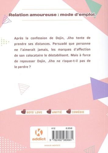 Comment faire face à une personne ouvertement amoureuse de soi : mode d'emploi. Après la confession de Dojin, Jiho tente d'instaurer une distance. Lui qui s'était persuadé que personne ne l'aimerait jamais, il a bien du mal à composer avec les marques d'affection de son colocataire. Mais à force de le rejeter, ne risque-t-il pas de le perdre ?