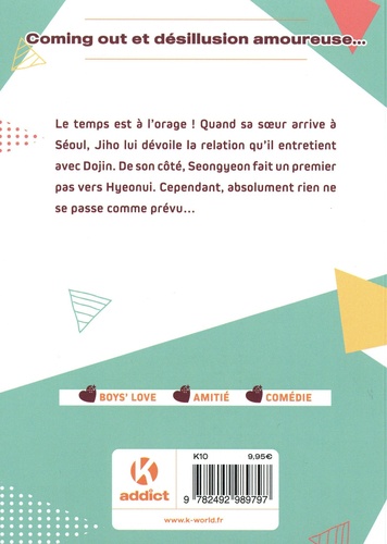 Coming out et désillusion amoureuse sont au programme de ce nouveau tome ! Le temps est à l'orage ! Quand sa soeur arrive à Séoul, Jiho lui dévoile la relation qu'il entretient avec Dojin. De son côté, Seongyeon fait un premier pas vers Hyeonui. Cependant, absolument rien ne va se passer comme prévu.