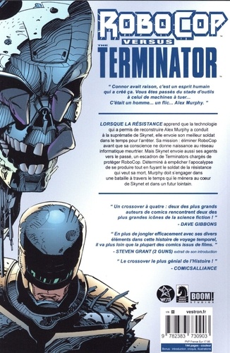 LORSQUE LA RESISTANCE apprend que la technologie qui a permis de reconstruire Alex Murphy a conduit à la suprématie de Skynet, elle envoie son meilleur soldat dans le temps pour rarreter. Sa mission : éliminer RoboCop avant que sa conscience ne donne naissance au réseau informatique meurtrier. Mais Skynet envoie aussi ses agents vers le passé, un escadron de Terminators chargés de protéger RoboCop. Déterminé à empécher l'apocalypse de se produire tout en fuyant le soldat de la résistance qui veut sa mod, Murphy doit s'engager dans une bataille à travers le temps qui le mènera au coeur de Skynet et dans un futur lointain.
