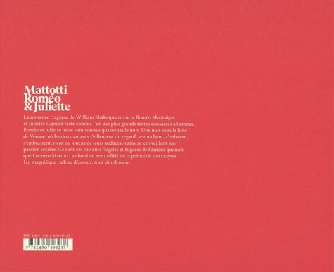 La romance tragique de William Shakespeare entre Roméo Montaigu et Juliette Capulet reste comme l'un des plus grands textes consacrés à l'amour. Roméo et Juliette ne se sont connus qu'une seule nuit. Une nuit sous la lune de Vérone, où les deux amants s'effleurent du regard, se touchent, s'enlacent, s'embrassent, rient ou jouent de leurs audaces, s'aiment et éveillent leur passion secrète. Ce sont ces instants fragiles et fugaces de l'amour qui naît que Lorenzo Mattotti a choisi de nous offrir de la pointe de son crayon. Un magnifique cadeau d'amour, tout simplement.