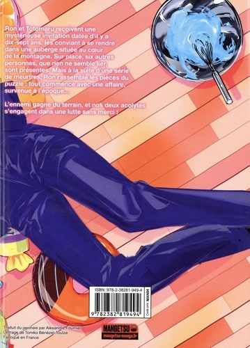 Ron et Totomaru reçoivent une mystérieuse invitation datée d'il y a dix-sept ans, les conviant à se rendre dans une auberge située au coeur de la montagne. Sur place, six autres personnes, que rien ne semble lier, sont présentes. Mais à la suite d'une série de meurtres, Ron rassemble les pièces du puzzle : tout commence avec une affaire, survenue à l'époque... L'ennemi gagne du terrain, et nos deux acolytes s'engagent dans une lutte sans merci ! Après Reborn ! , découvrez la nouvelle série à succès d'Akira Amano : Ron Kamonohashi : Deranged Detective ! Un manga d'enquête plébiscité par les lecteurs du Shonen Jump +, aux personnages loufoques et à la narration dynamique. "Avides de mystères et d'enquêtes insolubles ? Voici un nouveau détective dans le game : Ron Kamonohashi". Japan Live "Amano au sommet de son art. Un sans-faute ! " Dylan, libraire au Furet du Nord Louvroil " Ron Kamonohashi nous régale d'abord de sa fraîcheur, mais finit par nous intriguer pour tous ses mystères. " Animeland XTra "Ron Kamonohashi - Deranged detective possède un rythme haletant et une très bonne gestion du suspense et de la narration". L'Avis des bulles