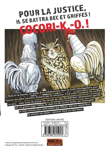 Pour la justice, il se battra bec et griffes ! Cocori-K. -O. ! Keiji et sa bande, en quête d'un orbemancien dans la forêt d'Aokigahara pour sauver son père mourant, finissent par le retrouver. C'est enfin l'occasion de souffler un peu... mais aussi de percer les secrets du clan Goshikidori, jalousement gardés par ce grand sage ! Hélas, le répit est de courte durée, car Tsumegaki, un kijin encore plus redoutable que Hikari, fait son apparition. Sa mission est claire : ramener Keiji au kijû blanc. Ecrit et dessiné par Shu Sakuratani, Rooster Fighter est un manga qui a su conquérir le coeur des lecteurs de nombreux pays. Action, parodie et humour sont au centre de ce récit survitaminé.