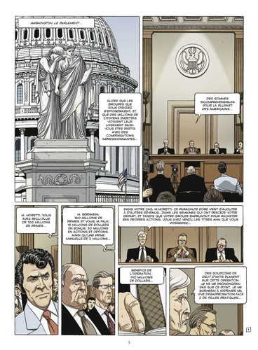 Washington. Aldo Moretti, patron déchu d'AHM, le n°1 du crédit hypothécaire, comparaît devant une commission d'enquête du Congrès. La débâcle de son groupe a ruiné des dizaines de milliers d'Américains... Quelques semaines plus tard, Moretti est abattu de trois balles au bord de sa piscine. Les agents du FBI Capelli et Horowitz vont avoir fort à faire pour démêler les fils d'une enquête complexe qui, une nouvelle fois, va les plonger au coeur de l'univers de la haute finance... Servi par le trait dynamique d'un Dominique Hé dont le talent ne cesse de se bonifier, Philippe Richelle, scénariste d'Amours Fragiles et des Coulisses du Pouvoir, entraîne le lecteur dans une intrigue d'une densité et d'une subtilité trop rares en bande dessinée.