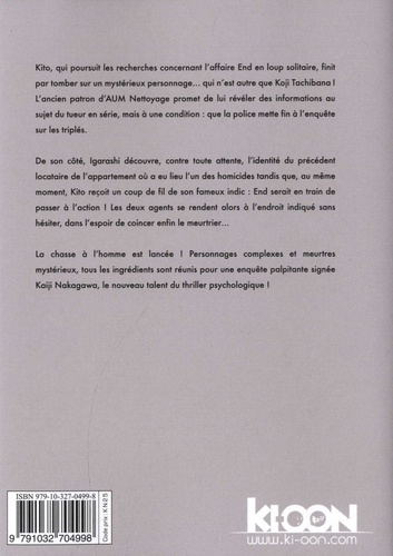 Un nettoyeur de cadavres aux trousses d'un serial-killer : un thriller meurtrier dans la veine de Seven ! Grâce à ses récentes découvertes, la police sait désormais qu'End, le tueur masqué, aurait deux jumeaux. Mais il reste insaisissable... et continue à sévir : Omi, qui tentait de surmonter son traumatisme pour reprendre une vie normale aux côtés de Yuka, est retrouvé assassiné, le corps découpé en morceaux... Dévastée par la mort brutale de son petit ami, la jeune femme s'isole et refuse l'aide de ses proches, jusqu'à disparaître complètement. C'est alors que l'enquête prend une tournure inattendue : le triplé C, soupçonné d'être End, aurait enfin été retrouvé ! La chasse à l'homme est lancée ! Personnages complexes et meurtres mystérieux, tous les ingrédients sont réunis pour une enquête palpitante signée Kaiji Nakagawa, le nouveau talent du thriller psychologique !