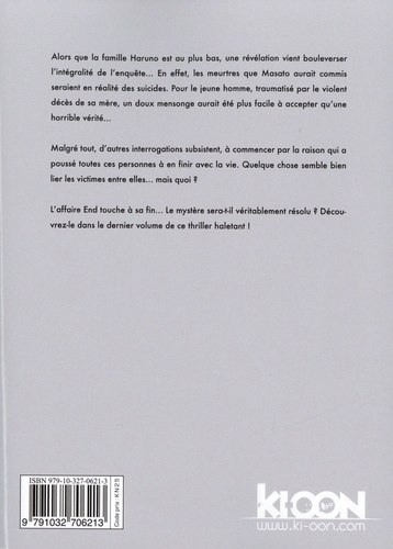 Alors que la famille Haruno est au plus bas, une révélation vient bouleverser l'intégralité de l'enquête... En effet, les meurtres que Masato aurait commis seraient en réalité des suicides. Pour le jeune homme, traumatisé par le violent décès de sa mère, un doux mensonge aurait été plus facile à accepter qu'une horrible vérité... Malgré tout, d'autres interrogations subsistent, à commencer par la raison qui a poussé toutes ces personnes à en finir avec la vie. Quelque chose semble bien lier les victimes entre elles... mais quoi ? L'affaire End touche à sa fin... Le mystère sera-t-il véritablement résolu ? Découvrez-le dans le dernier volume de ce thriller haletant !