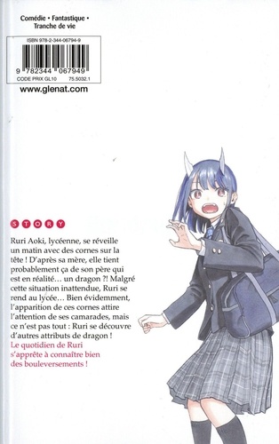 Mi-lycéenne, mi-dragon ! Ruri Aoki, lycéenne, se réveille un matin avec des cornes sur la tête ! D'après sa mère, elle tient probablement ça de son père qui est en réalité... un dragon ? ! Malgré cette situation inattendue, Ruri se rend au lycée... Bien évidemment, l'apparition de ces cornes attire l'attention de ses camarades, mais ce n'est pas tout : Ruri se découvre d'autres attributs de dragon ! Le quotidien de Ruri s'apprête à connaître bien des bouleversements ! La nouvelle pépite du Shonen Jump (le magazine de One Piece et Dr Stone) arrive enfin en France. Suivie dès sa prépublication au Japon, Ruridragon a déjà les faveurs d'une communauté étendue, particulièrement friande de thèmes aussi fédérateurs que l'adolescence, l'acceptation de soi, la tolérance et la bienveillance. La sortie du tome 2 s'est même classée 4e des meilleures ventes de mangas au Japon, dépassant des séries plus installées comme Gokurakugai ou Boruto - The Two Blue Vortex.