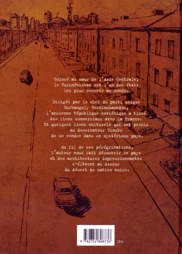 Coincé au coeur de l'Asie Centrale, le Turkménistan est l'un des états les plus secrets au monde. Dirigée par le chef du parti unique Gurbanguly Berdimuhamedow, l'ancienne République soviétique a tissé des liens commerciaux avec la France. Et quelques liens culturels qui ont permis au dessinateur Troubs de se rendre dans ce mystérieux pays. Au fil de ses pérégrinations, l'auteur nous fait découvrir ce pays où des architectures impressionnantes s'élèvent au-dessus du désert de sables noirs.