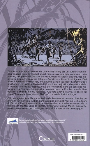Charles Marie René Leconte de Lisle (1818-1894) est un auteur réunionnais engagé pour le combat social. Son oeuvre multiple comprend : des poésies, des pièces de théâtre, des traductions d'auteurs anciens, des manifestes, des récits en prose tel que "Sacatove". Ce récit, rédigé en 1846 avant l'abolition d'esclavage, a été publié dans le journal "La Démocratie pacifique". Le poète y décrivait déjà son idéal de justice, d'équité sociale. Il prônait une société respectueuse de l'humanité dans un contexte historique, où l'on marchandait des hommes pour de l'or. Leconte de Lisle devient le chef de file du Parnasse. Puis vers la fin de sa vie, le poète est élu à l'Académie française en 1886, où il succède à Victor Hugo. Cet ouvrage est une libre adaptation de Sacatove et raconte l'histoire du jeune esclave à l'île Bourbon dans la région de Saint Paul sur les hauteurs du Bernica. Il accède au statut de commandeur et tombe amoureux de la fille de son maître. Epris de liberté, il s'enfuit et enlève Maria, mais cette passion amoureuse non partagée, le conduira vers un destin tragique.