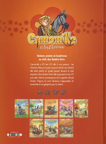 Camomille a 10 ans et elle a une passion : les chevaux. Mais ça n'a pas toujours été le cas Quand elle était petite et ridelle passait devant le dub équestre des Quatre-Fers, elle se pinçait le nez. Et puis, elle a fait la connaissance d'un superbe cheval, Océan Depuis, ils sont devenus inséparables et ensemble ils ne galopent pas ils volent