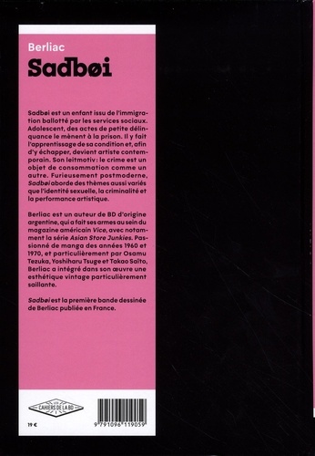 Sadboi est un enfant issu de l'immigration ballotté par les services sociaux. Adolescent, des actes de petite délinquance le mènent à la prison. Il y fait l'apprentissage de sa condition et, afin d'y échapper, devient artiste contemporain. Son leitmotiv : le crime est un objet de consommation comme un autre. Furieusement postmoderne, Sadboi aborde des thèmes aussi variés que l'identité sexuelle, la criminalité et la performance artistique. Berliac est un auteur de BD d'origine argentine, qui a fait ses armes au sein du magazine américain Vice, avec notamment la série Asian Store Junkies. Passionné de manga des années 1960 et 1970, et particulièrement par Osamu Tezuka, Yoshiharu Tsuge et Takao Saïto, Berliac a intégré dans son oeuvre une esthétique vintage particulièrement saillante. Sadboi est la première bande dessinée de Berliac publiée en France.