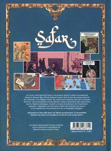 Le Coran, livre sacré de l'islam, est présent dans la culture européenne depuis le Moyen Age. S'il est d'abord traduit dans le but de comprendre et de combattre une religion rivale, le traductions donnent vite lieu à d'autres lectures : des protestants comme Martin Luther y cherchent des arguments contre l'Eglise catholique ; Goethe y trouve le summum de l'expression poétique ; Napoléon s'en sert pour tenter de conquérir les coeurs et les esprits des musulmans lors de sa campagne d'Egypte. Racontée en Docu-BD dans cet album passionnant, la formidable histoire du Coran en Europe ne cesse de nous surprendre !