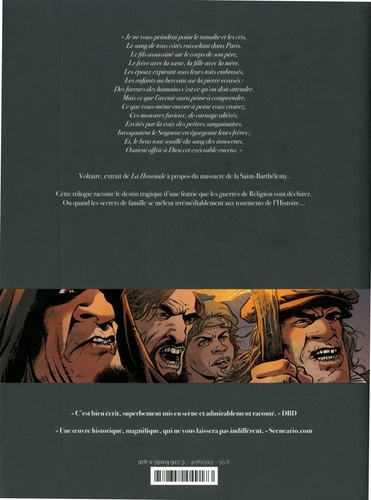 Lundi, 25 août 1572 "Arrive un moment où la question de tuer au nom de Dieu ne se pose plus... Nous tuons, nous prions... et nous recommençons." Les guerres de Religion gangrènent la France dans sa totalité. Le fanatisme s'instille patiemment, incontrôlable, dévastateur, aveugle. En 1562, Elie de Sauveterre, un jeune protestant, rejoint l'armée du prince de Condé pour retrouver son frère et sa soeur enlevés par les papistes. Des premières escarmouches au déchaînement ultime de la Saint-Barthélemy, emporté comme les autres par cette vague de violence frénétique, il sera bien malgré lui le héros de cette histoire-là.