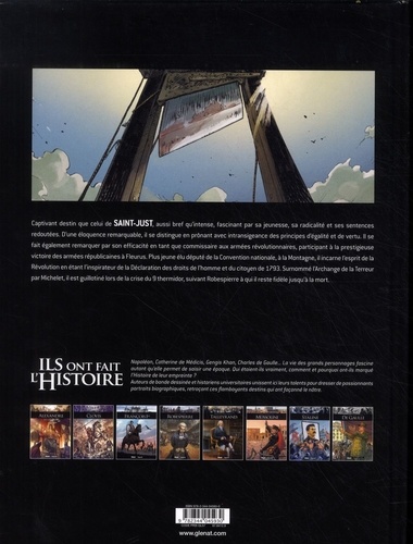 L'Archange de la Révolution. Captivant destin que celui de Saint Just, aussi bref qu'intense, fascinant par sa jeunesse, sa radicalité et ses sentences redoutées. D'une éloquence remarquable, il se distingue en prônant avec intransigeance des principes d'égalité et de vertu. Il se fait également remarquer par son efficacité en tant que commissaire téméraire aux armées révolutionnaires, participant à la victoire des armées républicaines à Fleurus. Plus jeune élu député de la Convention nationale, à la Montagne, il incarne l'esprit de la Révolution en étant l'inspirateur de la Déclaration des droits de l'homme et du citoyen de 1793. Surnommé l'Archange de la Terreur par Michelet, il est guillotiné lors de la crise du 9 thermidor, suivant Robespierre à qui il reste fidèle jusqu'à la mort. En s'attelant à narrer la vie d'un des personnages les plus célèbres - et clivants - de l'histoire de la Révolution française, Noël Simsolo accompagné de l'historien Jean Tulard nous livre un portrait subtil de cette figure emblématique raconté avec fougue et sérieux par Michael Malatini.