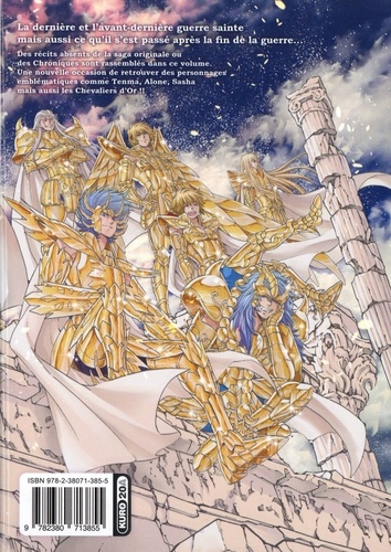 Plongez au coeur de la nouvelle aventure des Chevaliers du Zodiaque ! La dernière guerre Sainte, l'avant dernière mais aussi ce qu'il s'est passé après la fin de la guerre... Des récits non traités dans la saga originale ou dans les Chroniques sont ici rassemblés dans ce volume. Une nouvelle occasion de retrouver des personnages emblématiques comme Tenma, Alone, Saha mais aussi les Chevaliers d'Or !!
