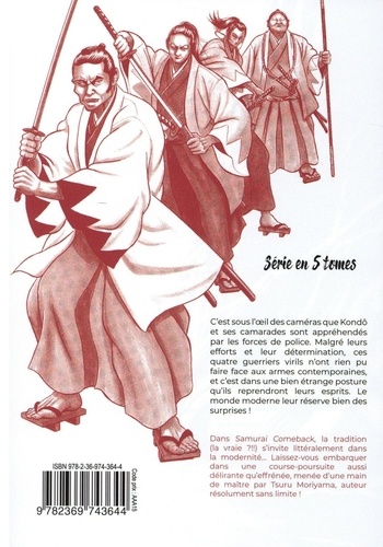 C'est sous l'oeil des caméras que Kondô et ses camarades sont appréhendés par les forces de police. Malgré leurs efforts et leur détermination, ces quatre guerriers virils n'ont rien pu faire face aux armes contemporaines, et c'est dans une bien étrange posture qu'ils reprendront leurs esprits. Le monde moderne leur réserve bien des surprises ! Dans Samurai Comeback, la tradition (la vraie ? !! ) s'invite littéralement dans la modernité... Laissez-vous embarquer dans une course-poursuite aussi délirante qu'effrénée, menée d'une main de maître par Tsuru Moriyama, auteur résolument sans limite !