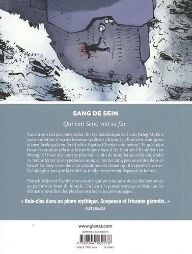 "Qui voit Sein, voit sa fin" Suite à son dernier best-seller, le très médiatique écrivain Brieg Mahé a pour ambition d'écrire le roman policier ultime. Un huis clos à énigmes si bien ficelé qu'il en ferait pâlir Agatha Christie elle-même ! Et quel plus beau décor pour cela que le mythique phare d'Ar-Men sur l'île de Sein en Bretagne ? Pour aller encore plus loin et afin de stimuler sa créativité, Mahé va même tenter une expérience unique : inviter 5 personnalités dans ce lieu et les faire vivre dans les conditions du roman qu'il s'apprête à écrire. Il n'imagine pas que la réalité va malheureusement dépasser la fiction... Après Ouessantines et Belle-île en père, Patrick Weber et Nicoby nous emmènent sur une autre de ces îles bretonnes au parfum de bout du monde. Un lieu à la poésie sauvage et brute où les éléments réveillent les plus bas instincts des personnages...