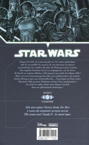 L’enquête de Zayne Carrick l’emmène, lui et ses compagnons, sur les terres d’un de ses anciens Maîtres Jedi, jusqu’à une cache de reliques Sith ! Mais c’est sur Coruscant qu’aura lieu son combat contre son mentor, Lucien Draay, et que son exil prendra fin, d’une façon ou d’une autre. Meurtrier Sith ou jeune Padawan victime d’une machination ? La vérité va enfin éclater dans un affrontement dantesque !