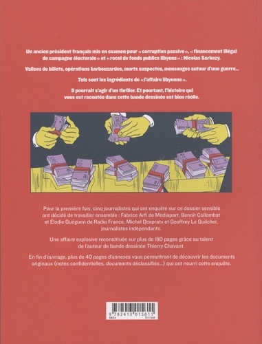 Cinq grands reporters assemblent pour la première fois le puzzle des liens entre l'ancien président français et le dictateur libyen. Une enquête événement sur la corruption au plus haut niveau de la République. Les enquêteurs de Mediapart ou Radio France assemblent les révélations d'un immense scandale d'état : intérêts pétroliers et nucléaires, financement de campagne, le tout sur fond d'intermédiaires véreux, d'opérations de désinformation et de décès mystérieux. Une BD-enquête choc alors que Nicolas Sarkozy a été mis en examen en mars2018.