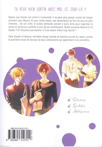 Depuis que Sasaki est entré à l'université, il ne peut plus passer autant de temps qu'avant avec Miyano. Et pour cette raison, ses sentiments se font de plus en plus intenses... De son côté, le lycéen demande conseil à leurs amis pour organiser la sortie en amoureux parfaite le jour de son anniversaire. Quelle surprise réserve-t-il à Sasaki ? Et l'étudiant parviendra-t-il à se retenir d'être trop tactile ? Dans Sasaki et Miyano, véritable manga hybride et énorme succès au Japon, suivez le quotidien empli de douceur de deux adolescents qui apprennent à se connaître...