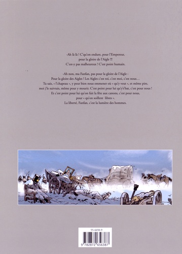 -Ah là là ! C'qu'on endure, pour l'Empereur, pour la gloire de l'Aigle !!! C'est-y pas malheureux ! C'est point humain. -Ah non, ma Fanfan, pas pour la gloire de l'Aigle : Pour la gloire des Aigles ! Les Aigles c'est toi, c'est moi, c'est nous... Tu sais, "l'chapeau", y peut bien nous emmener où "qu'y veut", et même pire, moi j'le suivrais, même pour y mourir. C'est point pour lui qu'y's'bat, c'est pour nous ! Et c'est point pour lui qu'on fait la fête aux canons, c'est pour nous, pour "qu'on soillent libres". La liberté, Fanfan, c'est la lumière des hommes.