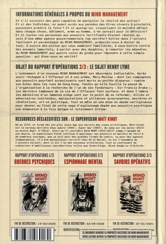 Informations générales à propos do mind management : Et s'il existait des gens capables de manipuler la réalité des autres ? Et si des individus, en ayant accès aux pensées des êtres vivants à proximité, pouvaient prédire le futur ? Et si quelqu'un, visualisant le moindre défaut dans chaque chose, bâtiment, arme ou homme, s'en servait pour le détruire ? Et si toutes ces personnes aux pouvoirs terrifiants étaient réunies au sein d'une même agence gouvernementale top secrète ? Entrez dans l'univers fascinant et paranoïaque du mind management, préparez-vous à douter de tout, à suivre des pistes qui vous semblent familières, à vous battre contre des ennemis immortels, à parler avec des dauphins, à remonter les méandres du mind management aux quatre coins du globe pour répondre à cette simple question : qui êtes-vous en vérité ? Objet du rapport d'opérations 3/3 : le sujet Henry Lyme. L'avènement d'un nouveau mind management est désormais inéluctable. Après avoir réchappé à l'Effaceur et à son armée, Meru Marlow -dont les compagnons aux pouvoirs pourtant surpuissants sont morts ou portés disparus - rumine son échec dans les rues de Hong Kong. Tandis qu'elle fouille le passé de l'organisation à la recherche de l'un de ses fondateurs - Sir Francis Drake -, les derniers lambeaux de la vie de l'Effaceur font surface, et dans l'ombre les mâchoires d'un immense piège sont sur le point de se refermer. Alliés et adversaires inattendus, manipulations et alliances surprenantes, mystères et révélations, art et politique, tout se mêle en une mise en abyme vertigineuse pour donner un final de cette saga d'espionnage dopée aux pouvoirs psychiques une dimension à la fois épique et totalement intime.