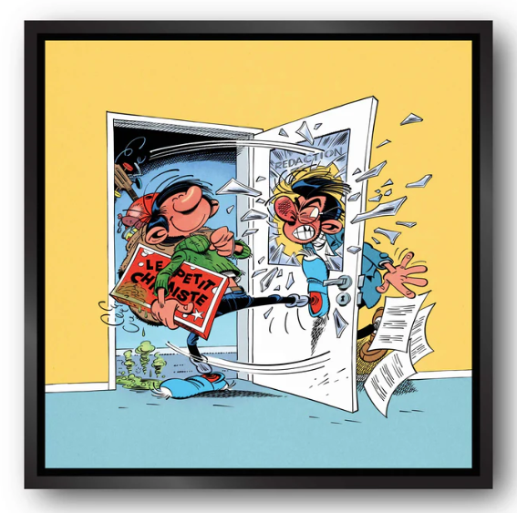 Tekening van André Franquin, een FINE ART-kwaliteit schilderij op een premium polycotton canvas van 350 g/m2, gemonteerd op een houten frame en voorzien van een ophanghaak.