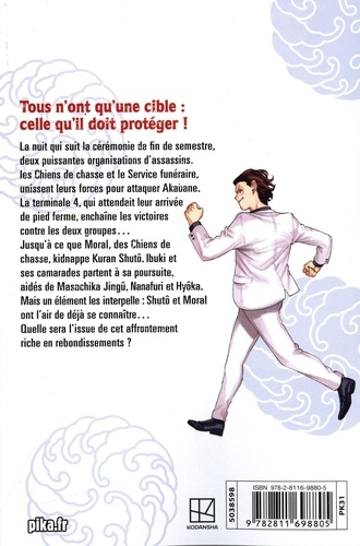 Tous n'ont qu'une cible : celle qu'il doit protéger ! La nuit qui suit la cérémonie de fin de semestre, deux puissantes organisations d'assassins, les Chiens de chasse et le Service funéraire, unissent leurs forces pour attaquer Akabane. La terminale 4, qui attendait leur arrivée de pied ferme, enchaîne les victoires contre les deux groupes... Jusqu'à ce que Moral, des Chiens de chasse, kidnappe Kuran Shutô. lbuki et ses camarades partent à sa poursuite, aidés de Masachika Jingû, Nanaferi et Hyûka. Mais un élément les interpelle : Shutû et Moral ont l'air de déjà se connaître... Quelle sera l'issue de cet affrontement riche en rebondissements ?