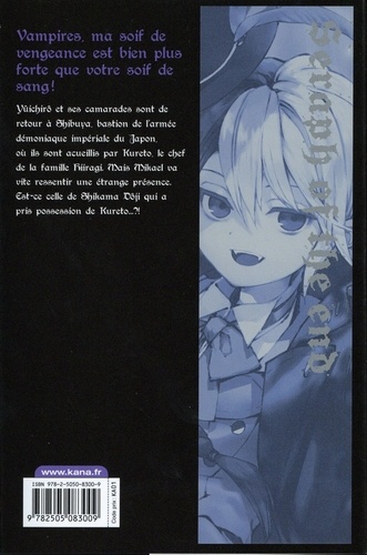 Vampires, ma soif de vengeance est bien plus forte que votre soif de sang ! Yûichirô et ses camarades sont de retour à Shibuya, bastion de l'armée démoniaque impériale du Japon, où ils sont acueillis par Kureto, le chef de la famille Kiiragi. Mais Mikael va vite ressentir une étrange présence. Est-ce celle de Shikama Dôji qui a pris possession de Kureto...? !