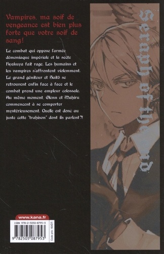 Le combat qui oppose l'armée démoniaque impériale et la secte Hyakuya fait rage. Les humains et les vampires s'affrontent violemment. Le grand géniteur et Saitô se retrouvent enfin face à face et le combat prend une ampleur colossale. Au même moment, Glenn et Mahiru commencent à se comporter mystérieusement. Quelle est donc au juste cette "trahison" dont ils parlent ? !