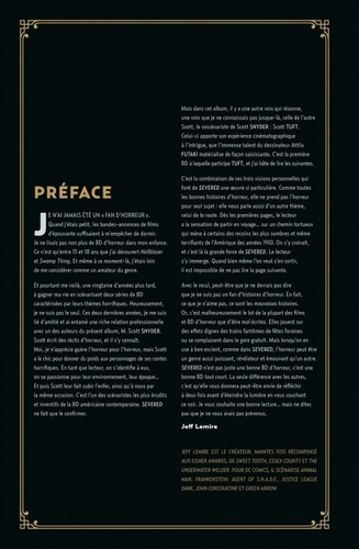 Début du XXe siècle. Sur les routes d'une Amérique à l'aube de sa modernisation, le Mal rôde à la recherche de sa prochaine victime. Son apparence et son origine importent peu. Il est. Il est celui qui entraînera l'enfant hors des sentiers, hors d'atteinte de la civilisation, hors de portée de tout secours. Ce Mal, le jeune Jack Garron l'a rencontré. Severed figure parmi l'un des récits d'horreur les plus marquants de ces dernières années. Imaginé par Scott Snyder (Batman, Swamp Thing) et son ami Scott Tuft, cette plongée dans l'angoisse s'offre pour terrain de jeu une Amérique aux routes encore sauvages. Récit sur l'abandon et l'espoir du père retrouvé, Severed offre à Attila Futaki (Percy Jackson et les Olympiens) un matériau de choix et permet aux talents du dessinateur d'atteindre une dimension évocatrice encore inédite. Severed est un récit dédié à tous les enfants, jeunes ou anciens, qui ont toujours su que le monstre tapi sous leur lit avait quelque chose de bien réel.