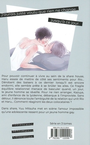 Pour pouvoir continuer à vivre au sein de la share house, Haru essaie de mettre de côté ses sentiments pour Rio... Dérobant des baisers à ce dernier lorsqu'il est encore endormi, elle semble prête à se brûler les ailes. Ce fragile équilibre relationnel menace de basculer quand, un jour, le jeune homme se réveille. Pour ne rien arranger, Kazuya, ami d'enfance de la lycéenne, débarque à l'improviste. Sans détour, il dénonce toute l'ambiguïté de la relation qui unit Rio et Haru... Comment réagiront les deux colocataires ? Série en 3 tomes