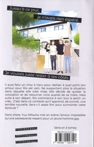 Il aura fallu un choc à Haru pour réaliser à quel point son amour pour Rio est vain. Ne supportant plus la situation dans laquelle elle s'est mise, elle décide de quitter la colocation et de retourner vivre auprès de sa mère. Mais suite à son départ, Rio commence à son tour à sentir un vide... C'est dans ce contexte qu'il apprend, de surcroît, une terrible nouvelle. Sera-t-il assez fort pour surmonter cette épreuve ? Dans share, Yuu Mitsuha met en scène l'amour impossible qu'une adolescente ressent pour un jeune homme gay.