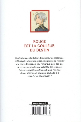 L'opération de plantation des phostyrias est lancée, et Shirayuki retourne à Lilias, impatiente de recevoir une nouvelle mission. Elle remarque alors des avis de recrutement collés dans la Cité des sciences. Qui est le mystérieux Shinsu Jiran à l'origine de ces affiches, et pourquoi souhaite-t-il engager un pharmacien ?