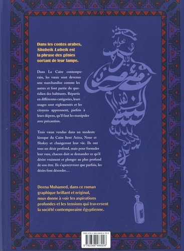 Dans les contes arabes, Shubeik Lubefk est la phrase des génies sortant de leur lampe. Dans Le Caire contemporain, les voeux sont devenus une marchandise comme les autres et font partie du quotidien des habitants. Répartis en différentes catégories, leurs usages sont réglementés et les citoyens apprennent, parfois à leurs dépens, qu'il faut les manipuler avec précaution. Trois voeux vendus dans un modeste kiosque du Caire lient Aziza, Nour et Shokry et changeront leur vie. Ils ont tous un désir profond, mais pour formuler leur voeu, chacun doit se demander ce qu'il désire vraiment et plonger au plus profond de son titre. Ils s'apercevront que parfois, les désirs font désordre... Deena Mohamed, dans ce roman graphique brillant et original, nous donne à voir les aspirations profondes et les tensions qui traversent la société contemporaine égyptienne.
