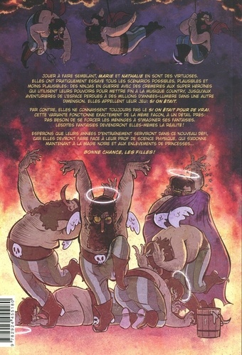 Jouer à faire semblant, MARIE et NATHALIE en sont des virtuoses. Elles ont pratiquement essayé tous les scénarios possibles, plausibles et moins plausibles : des ninjas en guerre avec crèmeries aux super héroïnes qui utilisent leurs pouvoirs pour mettre fin à la musique country, jusqu'aux aventurières de l'espace perdues à des millions d'années-lumière dans une autre dimension. Elles appellent leur jeu : SI ON ETAIT. Par contre, elles ne connaissent toujours pas le SI ON ETAIT POUR DE VRAI. Cette variante fonctionne exactement de la même façon, à un détail près : pas besoin de se forcer les méninges à s'imaginer ses fantaisies. Lesdites fantaisies deviendront elles-mêmes la réalité ! Espérons que leurs années d'entrainement serviront dans ce nouveau défi, car elles devront faire face à leur prof de science physique, qui s'adonne maintenant à la magie noire et aux enlèvements de princesses... BONNE CHANCE, LES FILLES !