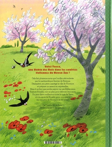 Voici Tosca, une Robin des Bois dans les contrées italiennes du Moyen Age ! Cela fait plusieurs mois que Lucia a été enlevée par le machiavélique Gautier de Brienne. Désespéré, son père a assiégé la ville de Florence et prépare un assaut en représailles. Mais il ne faut pas perdre espoir car ses fidèles amis, Tosca et Rinaldo, ont un plan pour délivrer leur amie. On peut faire confiance à toute la ruse de Tosca et à la verve de Rinaldo pour convaincre les citoyens de Florence de les aider ! Car l'union fait la force ! Et l'amitié fait fi des guerres !