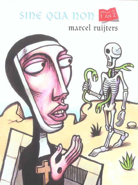 Des nonnes médiévales pratiquent l'humour splastick, des stigmates apparaissent comme des bubons par temps de peste, les éléments météorologiques s'incarnent pour éventuellement servir de carburant à toute embarcation et pour que tout le monde comprenne bien, les rares textes sont en latin (la version de cuisine de préférence, mais rassurez-vous, un glossaire figure dans l'ouvrage). Alternant planches dessinées et cartes à gratter, Marcel Ruijters dépeint en 8 histoires un Moyen Age qu'on n'imaginait pas si comique. Posant les bases de cette écriture qui lui servit par la suite à composer les bien plus sérieux Inferno et Les Bienheureuses (publiés en 2013 et 2022 aux éditions The Hoochie Coochie), Sine Qua Non est un recueil que se doit de connaître tout amateur d'histoire médiévale. Publié initialement en 2005 aux éditions l'An 2, cette nouvelle édition de Sine Qua Non s'enrichit de deux textes (de son éditeur ainsi que de l'auteur lui-même) visant à souligner la pertinence du regard de Marcel Ruijers sur l'art médiéval et la façon dont cet art a nourri de tout temps les créateurs de bande dessinée.