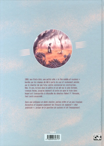 1960, aux Etats-Unis, une petite ville "in the middle of nowhere" bordée par les champs de blé à perte de vue et seulement animée par le chantier de son futur rentre commercial en construction... Rob, 14 ans, le bras dans le plâtre et un oeil sur la jolie Sixteen, s'ennuie ferme, jusqu'au moment où entre en gare le train dans lequel est transportée la dépouille du sénateur Robert F Kennedy. tout juste assassiné... Dans une ambiante en demi-teintes, parfois drôle et un peu tragique, Ducoudray et Quignon explorent les fissures du supposé "rêve américain", autour de la question du racisme et de l'engagement.