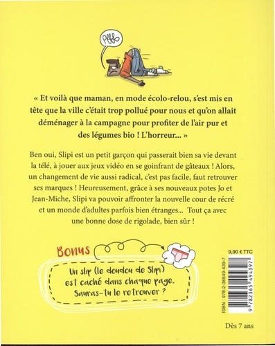 "Et voilà que maman, en mode écolo-relou, s'est mis en tête que la ville c'était trop pollué pour nous et qu'on allait déménager à la campagne pour profiter de l'air pur et des légumes bio ! L'horreur...". Ben oui, Slipi est un petit garçon qui passerait bien sa vie devant la télé, à jouer aux jeux vidéo en se goinfrant de gâteaux ! Alors, un changement de vie aussi radical, c'est pas facile, faut retrouver ses marques ! Heureusement, grâce à ses nouveaux potes Jo et Jean-Miche, Slipi va pouvoir affronter la nouvelle cour de récré et un monde d'adultes parfois bien étranges... Tout ça avec une bonne dose de rigolade, bien sûr !