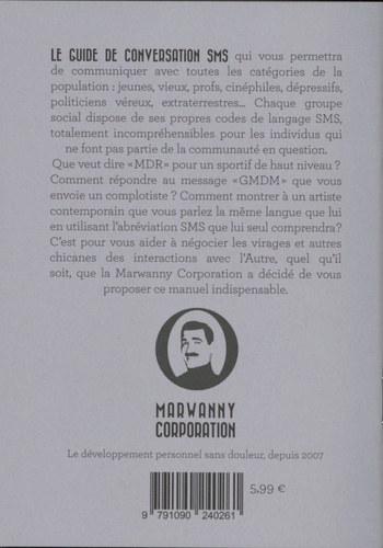 LE guide de conversation SMS qui vous permettra de communiquer avec toutes les catégories de la population. Jeunes, vieux, winners, losers, fonctionnaires, cinéphiles, dépressifs chroniques, politiciens véreux, extraterrestres... Chaque groupe social donné dispose de ses propres codes de langage SMS, totalement incompréhensibles pour les individus qui ne font pas partie du groupe en question. Que veut dire "PTDR" pour un orthorexique ? Comment répondre au message "GMDM" que vous envoie un complotiste ? Comment montrer à un artiste contemporain que vous parlez la même langue que lui en utilisant l'abréviation SMS que lui seul comprendra ? C'est pour vous aider à négocier les virages et autres chicanes des interactions avec l'Autre, quel qu'il soit, que la Marwanny Corporation a décidé de vous proposer ce manuel indispensable.