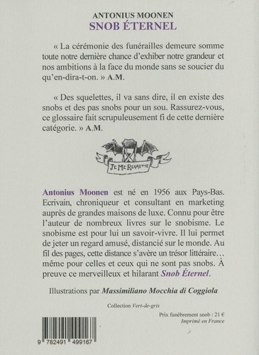 "La cérémonie des funérailles demeure somme toute notre dernière chance d'exhiber notre grandeur et nos ambitions à la face du monde sans se soucier du qu'en-dira-t-on". ANTONIUS MOONEN Après le succès de notre anthologie Du Snobisme par Robert de Montesquiou, il était palpitant et très amusant d'envisager le snobisme sous des aspects plus... funéraire ! SNOBISME PAS MORT ! C'est le pari gagné par Antonius Moonen, écrivain à la réputation croissante, dont toute l'oeuvre tourne autour de cette question fondamentalement humaine : le Snobisme. LE LIVRE : Snob Eternel est un abécédaire. Il contient des entrées telles que les mots bière, catafalque, condoléances, dolmen, linceul, obit, gerbe, oraison funèbre, panthéon, taxidermie, ou plus étonnant wifi. Ce savoureux essai, entre humour noir, plongée historique, et raffinement littéraire, contient aussi, en sa toute fin, une série d'interviews snobs, pas piquée des vers. L'ouvrage est entièrement illustré par Massimiliano Mocchia di Coggiola. Nombreuses illustrations délicieusement macabres. Humour noir garanti.